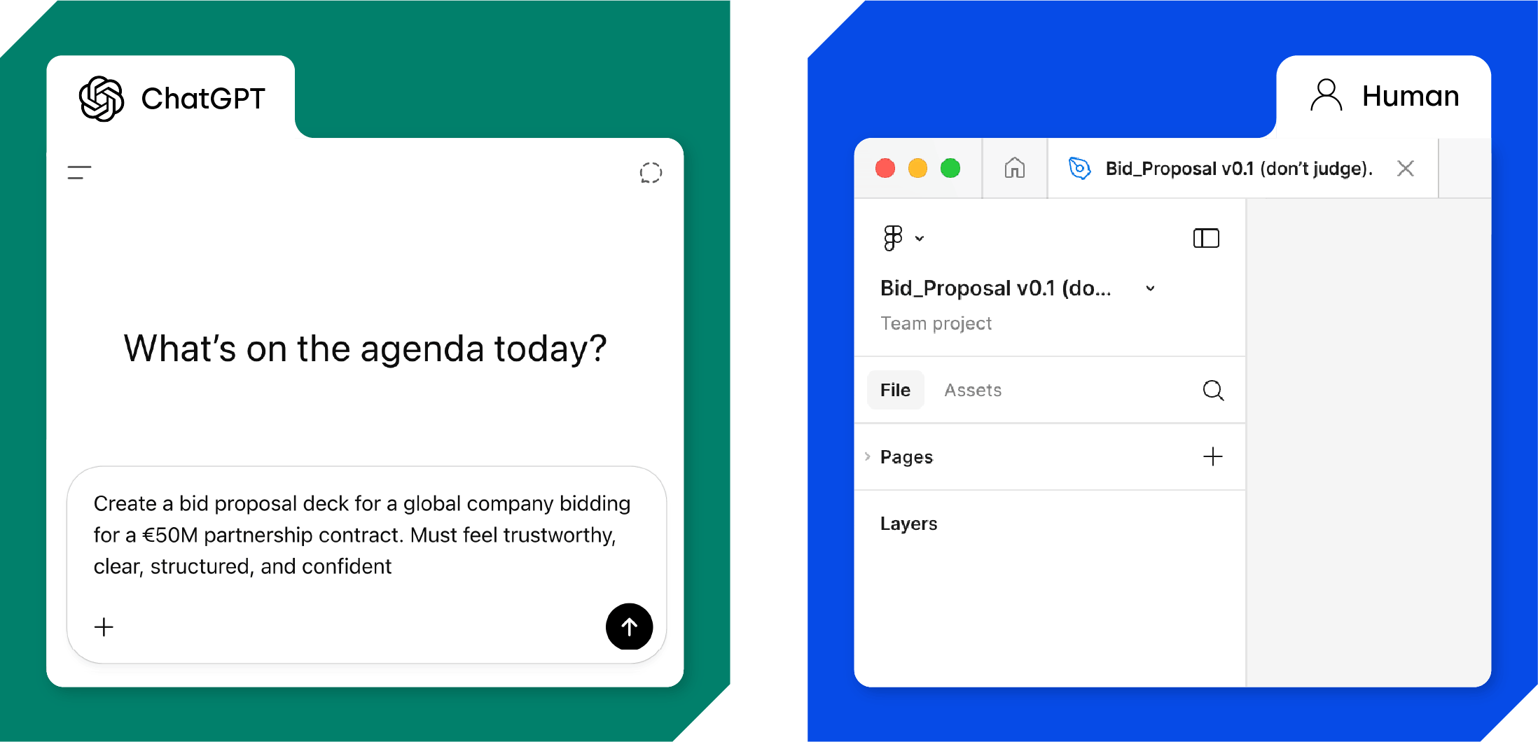 We gave the same €50M bid proposal brief to AI and to our world-class designer, Michał. AI finished in under 50 seconds. Michał finished in 7 hours, 19 minutes, three layout rewrites, and one deep-thinking stare out the window. Both decks got the message across — but only one felt like it would actually win the contract.