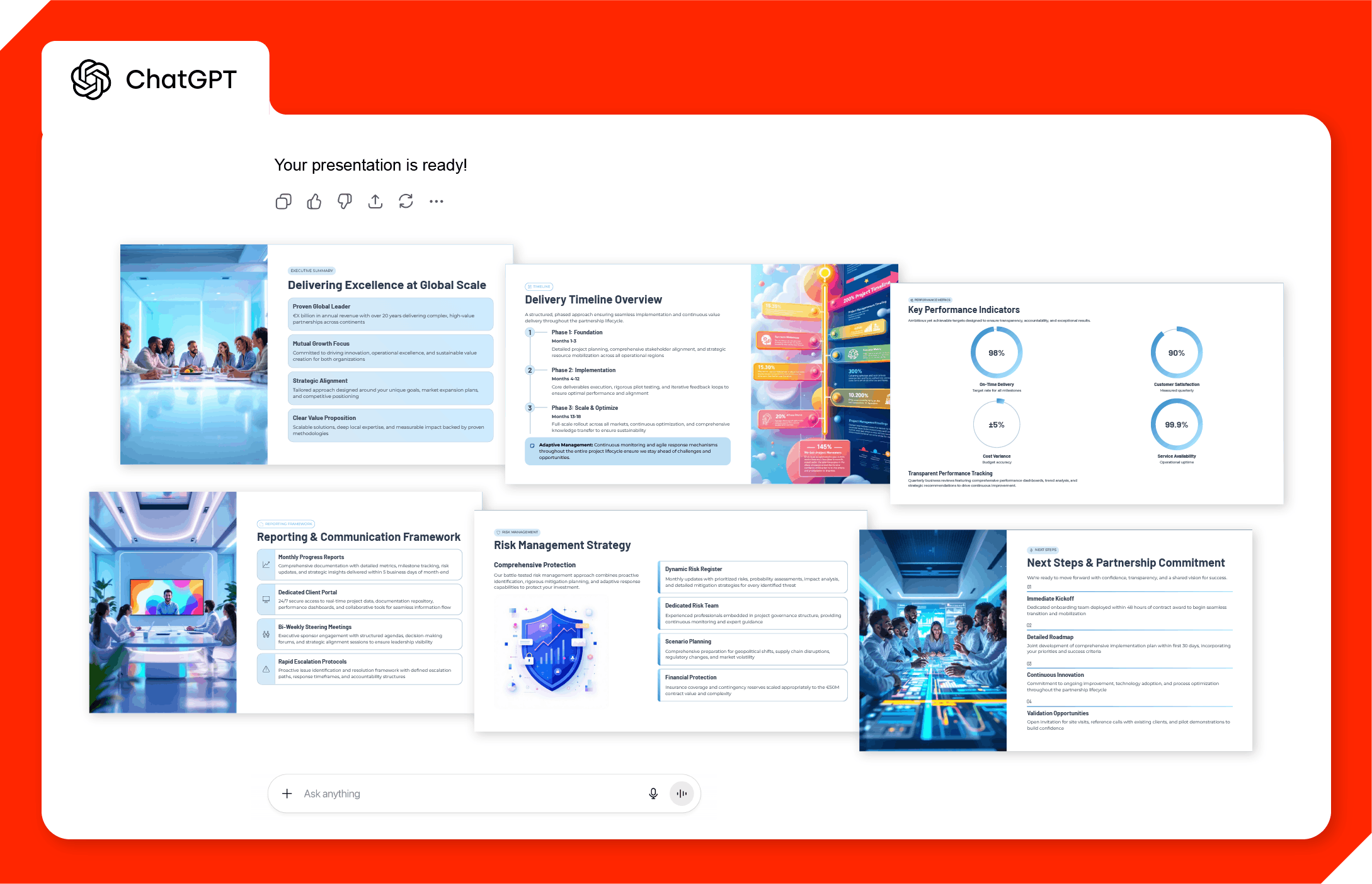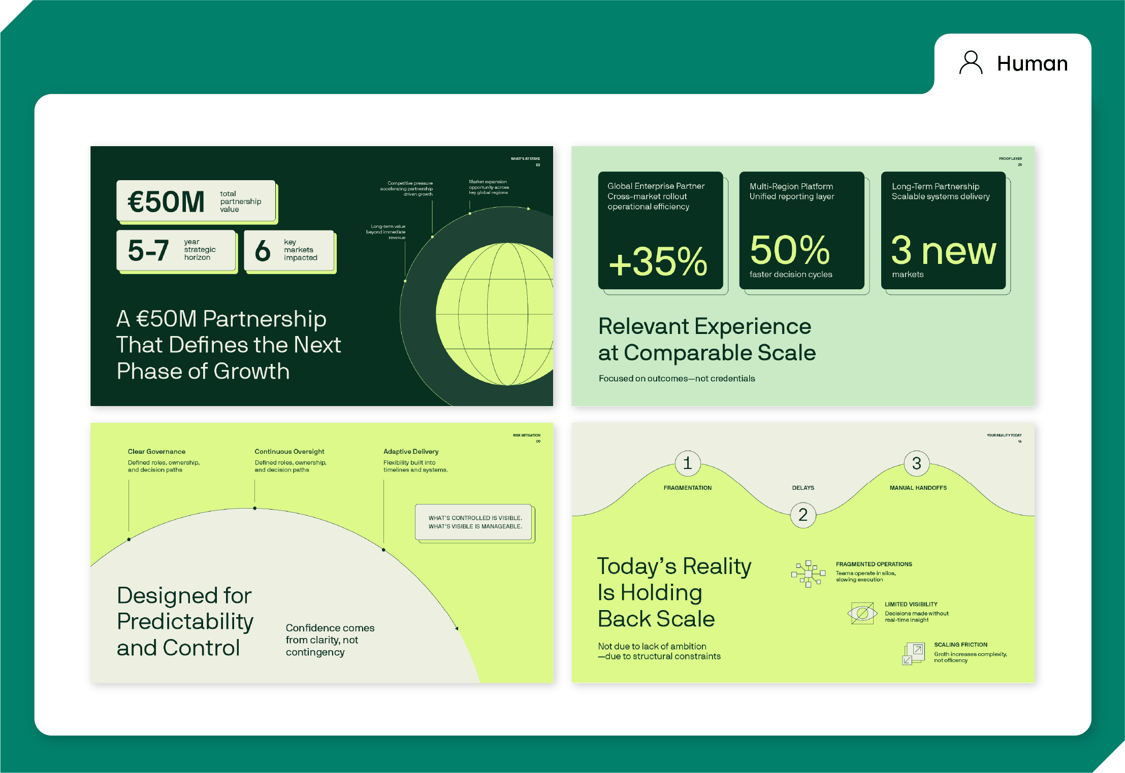 “Create a bid proposal deck for a global company bidding for a €50M partnership contract. Must feel trustworthy, clear, structured, and confident.”